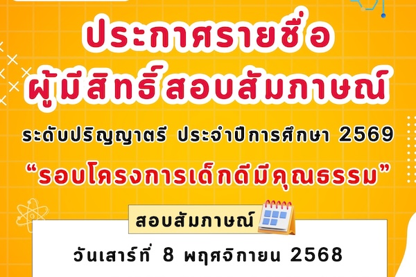 ประกาศรายชื่อผู้มีสิทธิ์สอบสัมภาษณ์ ระดับปริญญาตรี โครงการเด็กดีมีคุณธรรม ประจำปีการศึกษา 2569