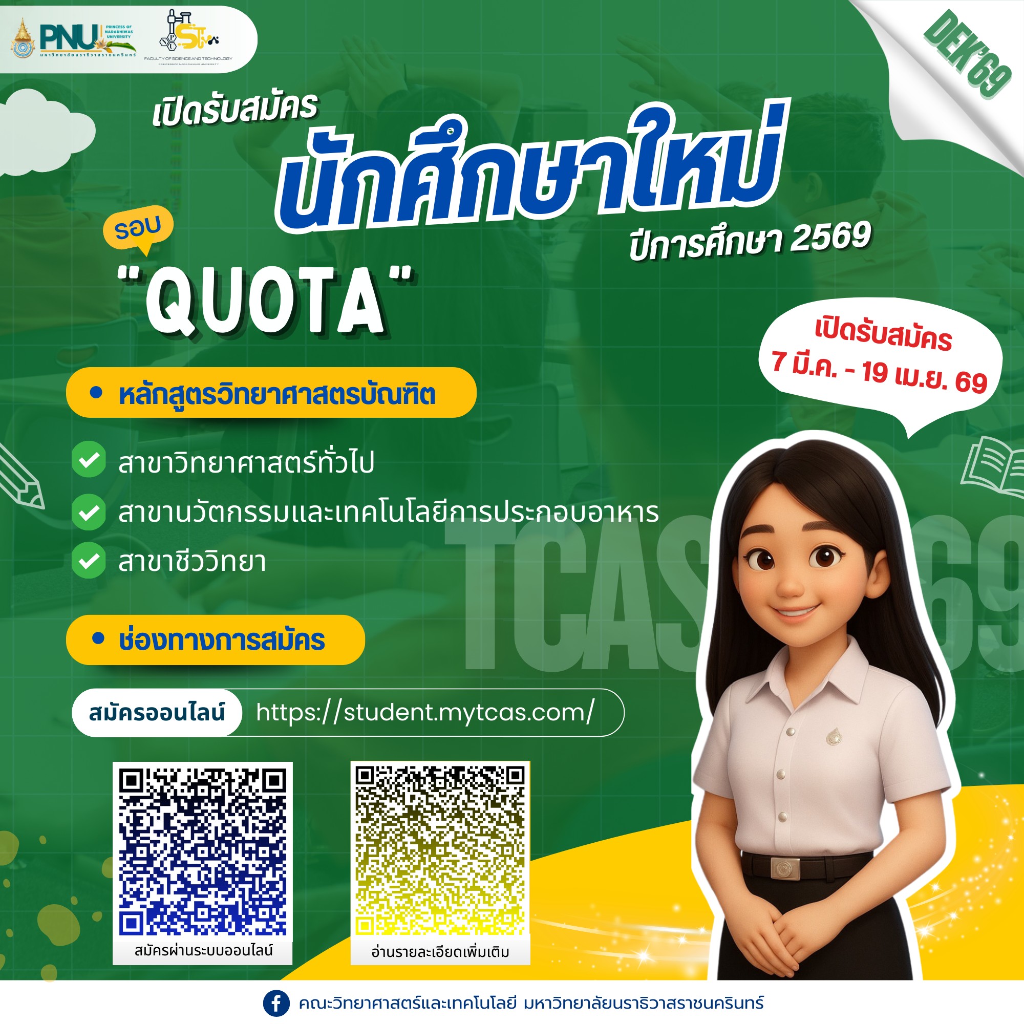 คณะวิทยาศาสตร์และเทคโนโลยี มหาวิทยาลัยนราธิวาสราชนครินทร์ เปิดรับสมัครนักศึกษาใหม่ ระดับปริญญาตรี ประจำปีการศึกษา 2569 รอบ Quota หลักสูตรวิทยาศาสตรบัณฑิต
